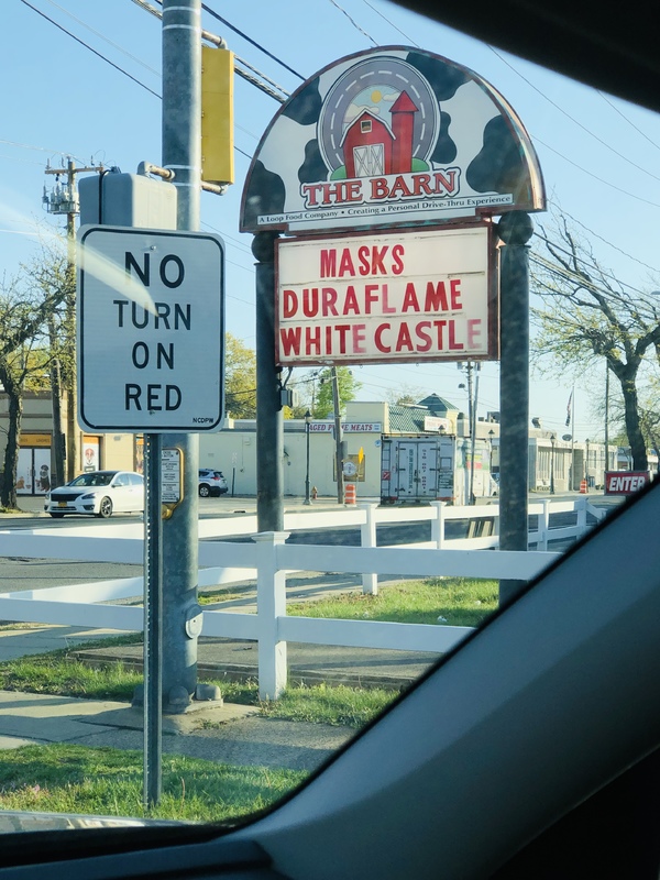 I live on Long Island, in New York. I was stopped at a traffic light and happened to see this sign for “The Barn”. The Barn is a drive through grocery store and there are several of them on Long Island. Usually the sign advertises ice cream, milk, eggs. This day, the important items are “masks, Duraflame, White Castle”. I thought that this was an odd combination of necessities, and if I had seen this sign at any other time I would be confused. But it sadly made perfect sense to me. Masks because we can’t go anywhere without them. Duraflame because people are at home and enjoying fires. And White Castle because fast food restaurants are closed or deemed unsafe. This sign made me sad - because of what it said, and because I understood it.