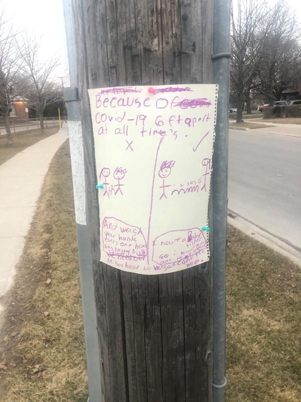 A sign a child made in a Toronto neighbourhood to remind people of what physical distancing in. The child expresses concern for his community, the world, and for his baby sister especially. The sign reads "Because of Covid-19 6 ft apart at all time's./ And wash your hands every one has [illegible]/ we need our neighborhood