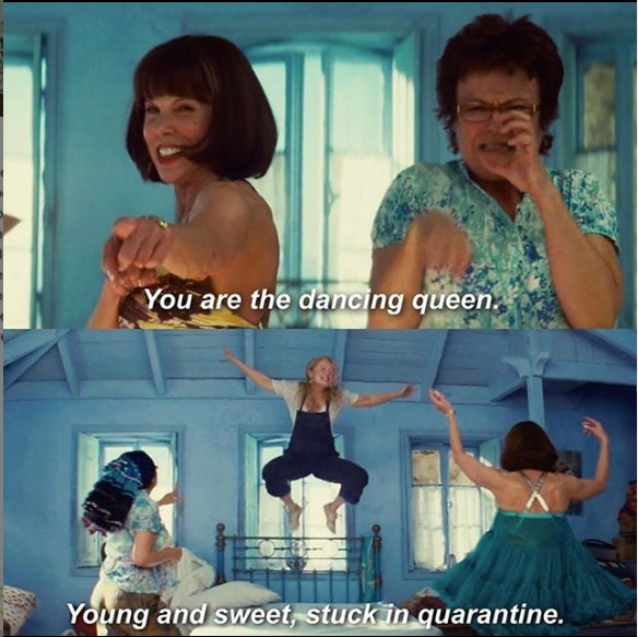 A meme taking the lyrics to the ABBA song Dancing Queen as sung in the movie Mamma Mia and changing them to express the sentiment of being young and wanting to be out and having fun but being restricted by the pandemic