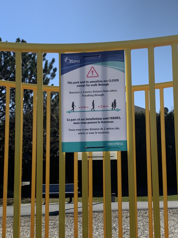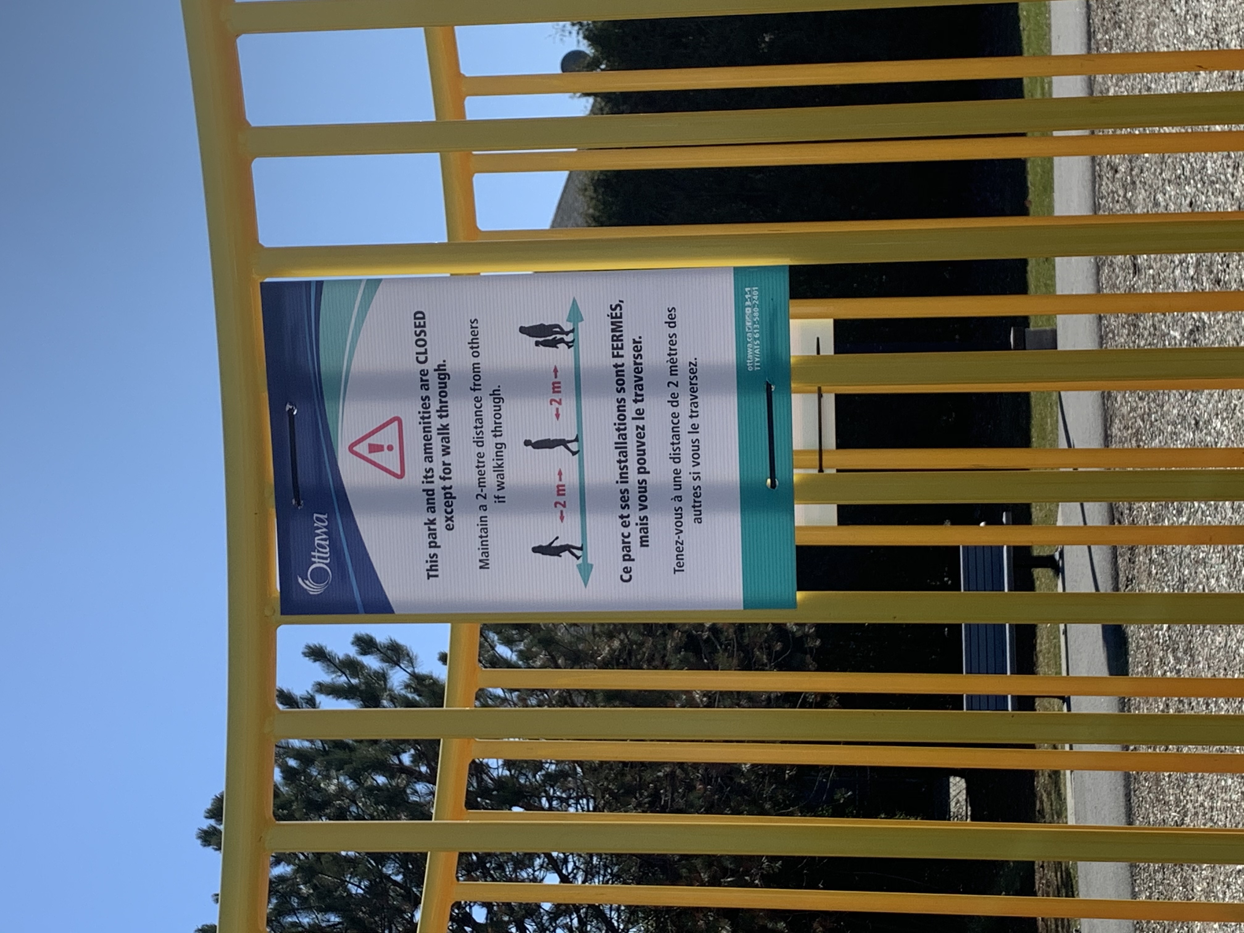 A photograph of a bilingual sign from the City of Ottawa zip tied to a play structure at Calzavara Family Park declaring the park closed and you are only allowed to walk through it.