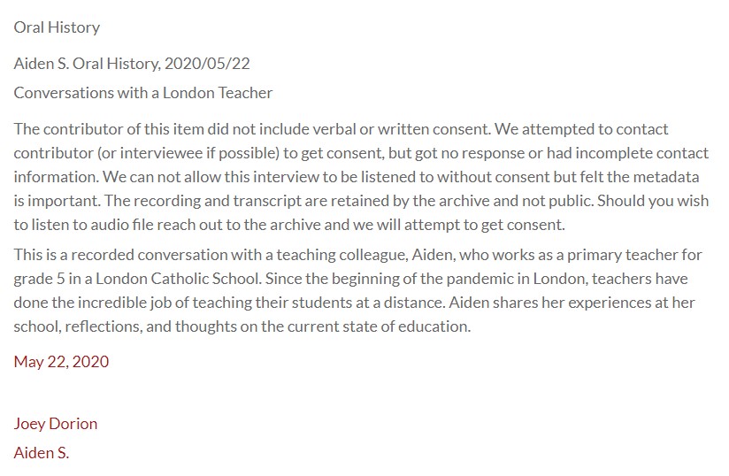 This item was submitted on May 27, 2020 by Joey Dorion using the form “Share Your Story” on the site “A Journal of the Plague Year”: https://covid-19archive.org/s/archive