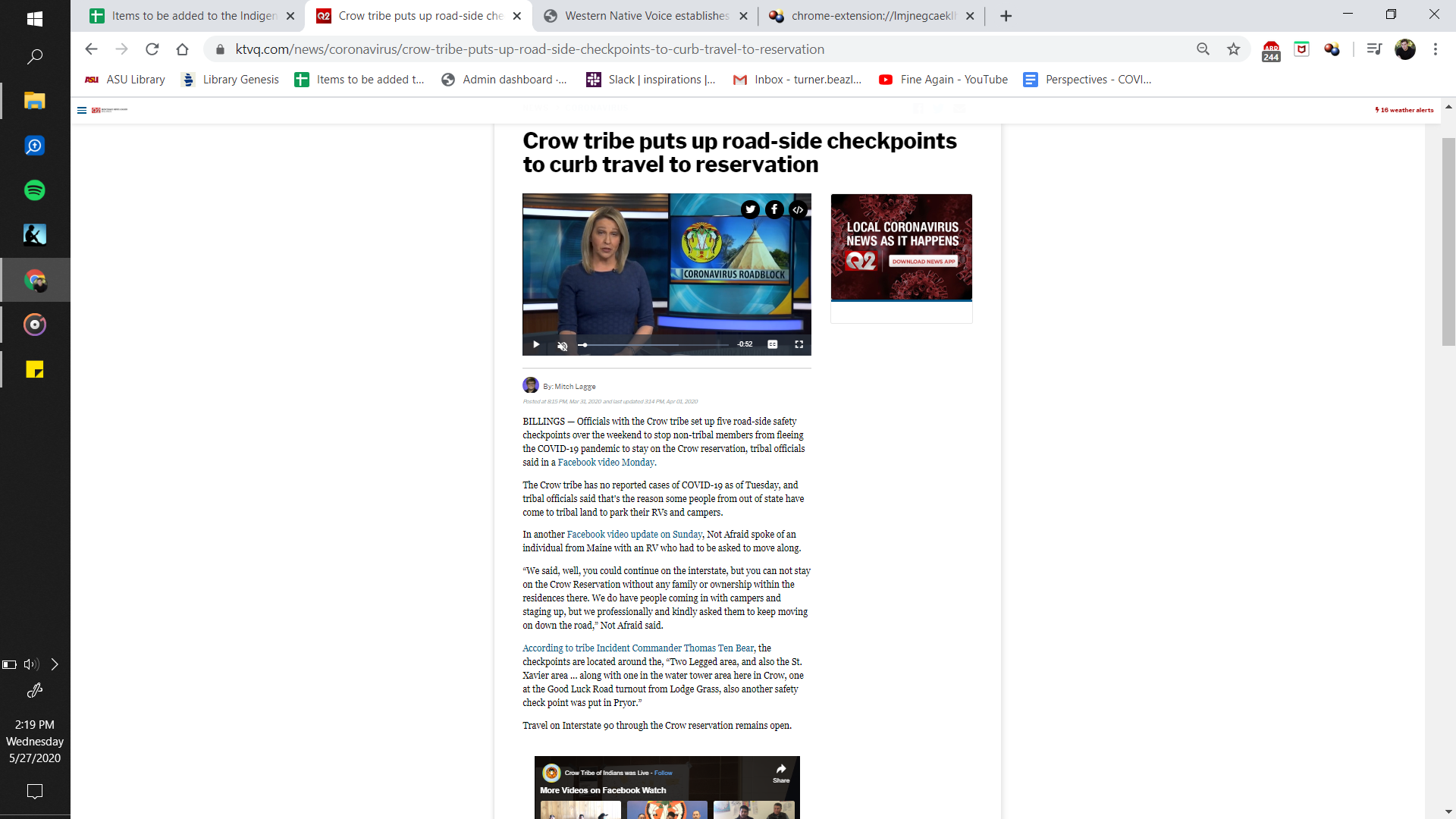 "BILLINGS — Officials with the Crow tribe set up five road-side safety checkpoints over the weekend to stop non-tribal members from fleeing the COVID-19 pandemic to stay on the Crow reservation, tribal officials said in a Facebook video Monday."