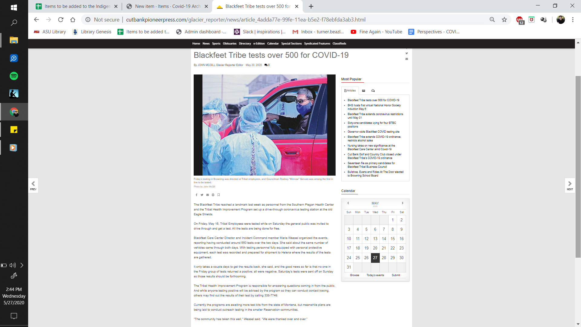 The Blackfeet Tribe reached a landmark last week as personnel from the Southern Piegan Health Center and the Tribal Health Improvement Program set up a drive-through coronavirus testing station at the old Eagle Shields.