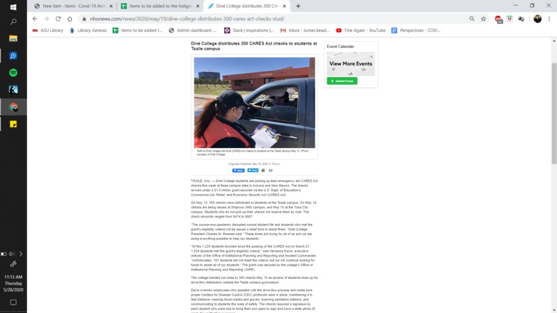 "TSAILE, Ariz. — Diné College students are picking up their emergency aid CARES Act checks this week at three campus sites in Arizona and New Mexico. The checks arrived under a $1.3 million grant secured via the U.S. Dept. of Education’s Coronavirus Aid, Relief, and Economic Security Act (CARES Act)."