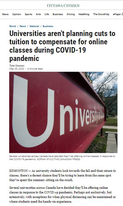 Article regarding the call for a reduction in university tuition for the upcoming school year/term from the Canadian Federation of Students and student governments across the country and the refusal of many major universities to do so. The universities rationale is that the quality of education will not be effected by the move to predominantly online/distant classes and that they are fulfilling all their obligations. The article outlines the decisions of each of the major Canadian universities including Dalhousie, McGill, the University of Toronto, the University of Ottawa, Carleton, Queen's, the University of Winnipeg, the University of Alberta, and the University of British Columbia.