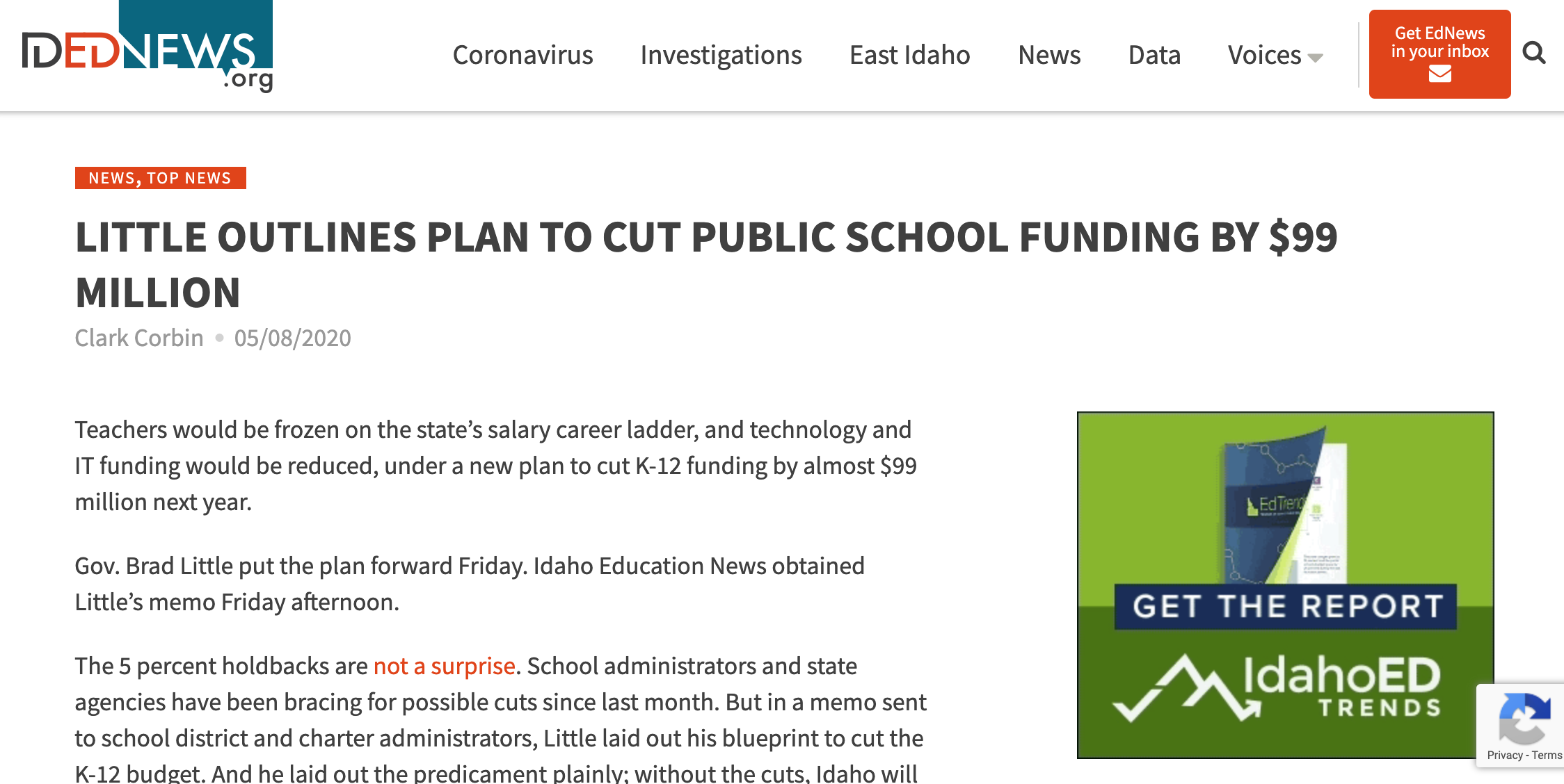 Idaho schools faced a 1% holdback when COVID-19 struck. We are facing additional budget cuts going into 2020-2021 school year.