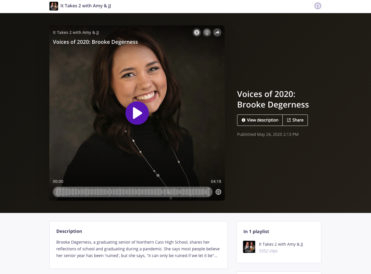 Brooke Degerness is a 2020 graduate of Northern Cass High School in North Dakota. She was interviewed by a local radio station and shared a positive message to other graduating seniors in the area.