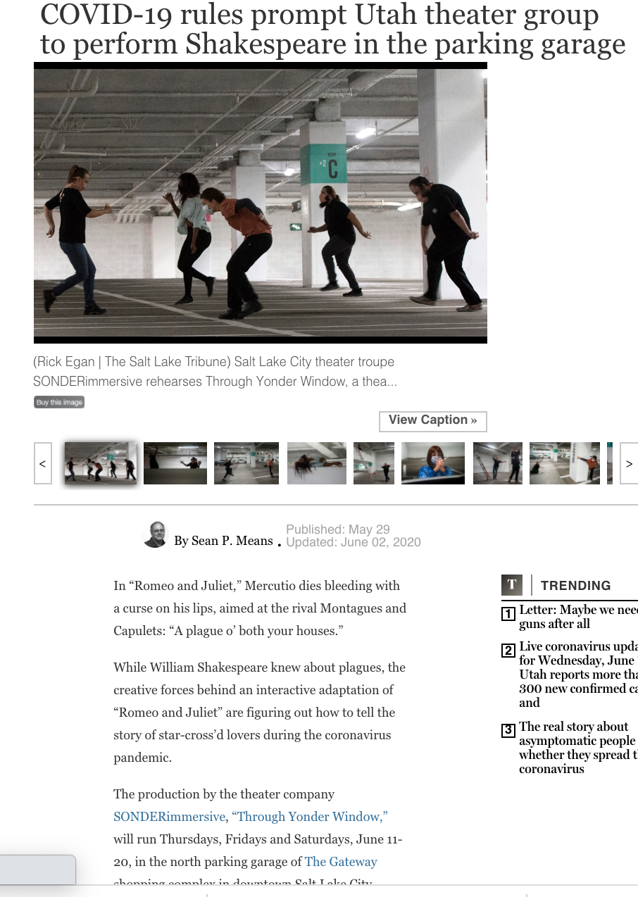 "The interactive theater production “Through Yonder Window,” based on “Romeo and Juliet,” produced by the experimental Salt Lake City group SONDERimmersive. Using COVID-19 safety precautions • Audience members must stay in their cars, with windows open a bit, throughout the performance. No restrooms are available. Performers will wear face masks, and stay at least 6 feet apart at all times. Cars will likely come into contact with performers, materials, soap and water." This is how artist are attempting to further their craft and stay alive during a devastating time for their trade.