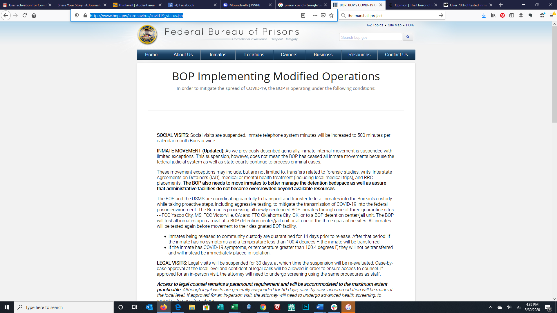 Bureau of Federal Prisons Covid 19 Modified Operations