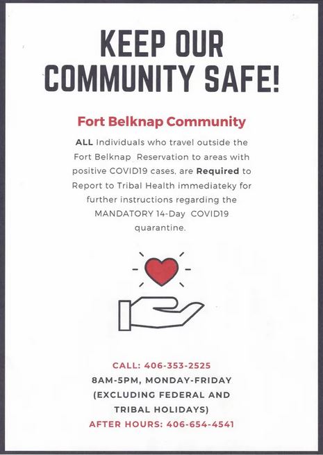 "All individuals who travel outside the Fort Belknap Reservation to areas with positive COVID19 cases, are required to report to tribal health immediately for further instructions regarding the MANDATORY 14-day COVID19 quarantine."
