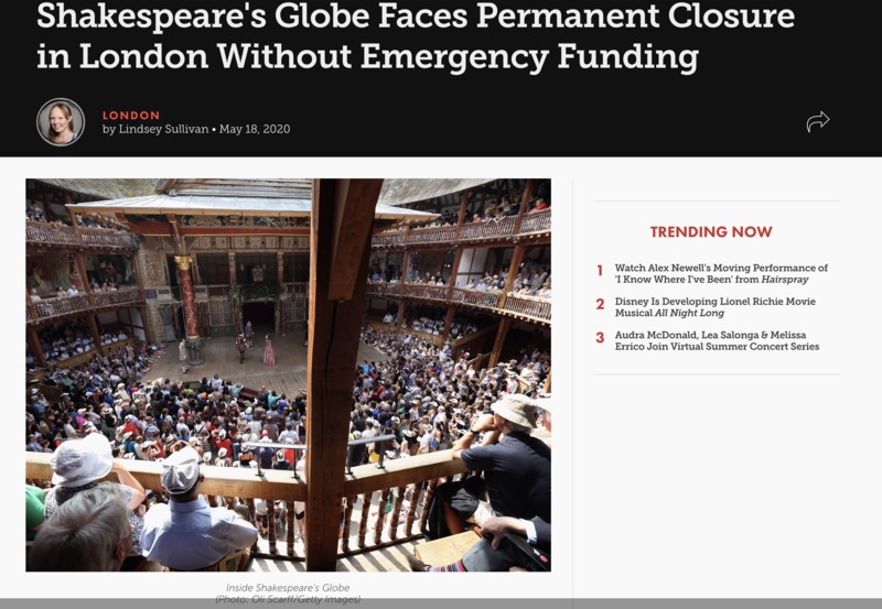 The coronavirus pandemic has already caused the shutdown of theaters in the West End and on Broadway. I have included this because there is a great fear of losing theatre companies and venues during the crisis. Funding is non-existent and actors, technicians and all others who rely on these theaters as resources for making a living will be left unemployed and searching for work in an even more saturated market.