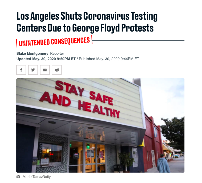 The public health implications of the George Floyd protests are interesting and scary to consider. Shutting down COVID-19 testing centers in one of the country's largest cities will surely have an impact on managing the pandemic which still rages on. However, the protests of George Floyd's death are an important development for social justice and advocating for reforms. I worry for the safety and health of everyone involved in the protests as well as the public health implications of not testing for the virus in one of the country's largest cities. It seems almost impossible to strike the right balance in this case.