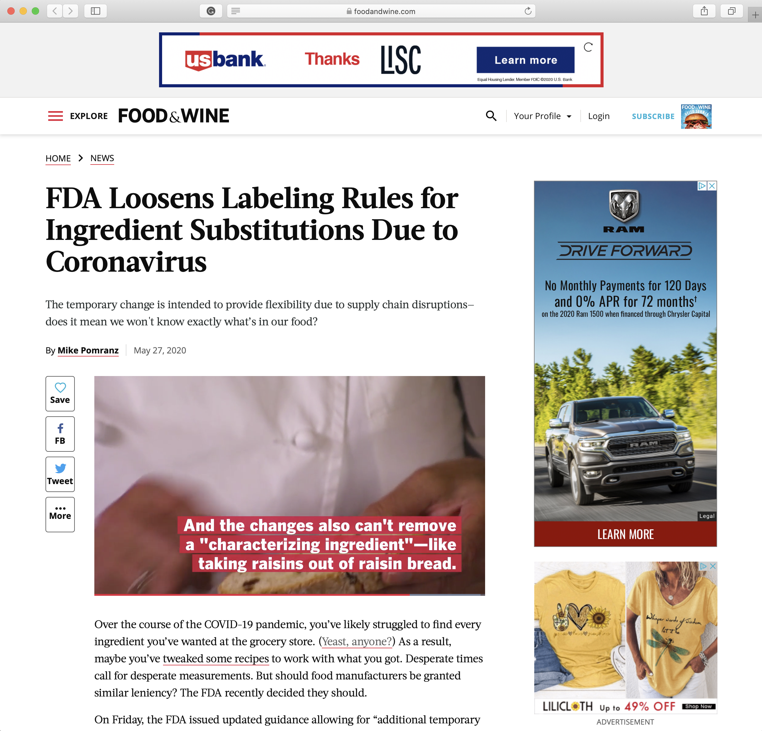 Consumers have seen a shortage of ingredients and food like yeast, beef, or eggs. The same goes for food companies. The article by Food & Wine addresses how the FDA has loosened its regulations on ingredient substitutions due to the coronavirus pandemic. While some of these substitutions may seem inconsequential and even good, like not bleaching bread flour because the bleaching agent is out of stock. Why are we still bleaching bread flour anyways? The issue is how this will affect ingredient substitutions in the future as there is no set end date for these new rules. Wiggle room with ingredients can get dangerous for consumers, and while it may be necessary for the moment, it will have an effect on our food in the future.