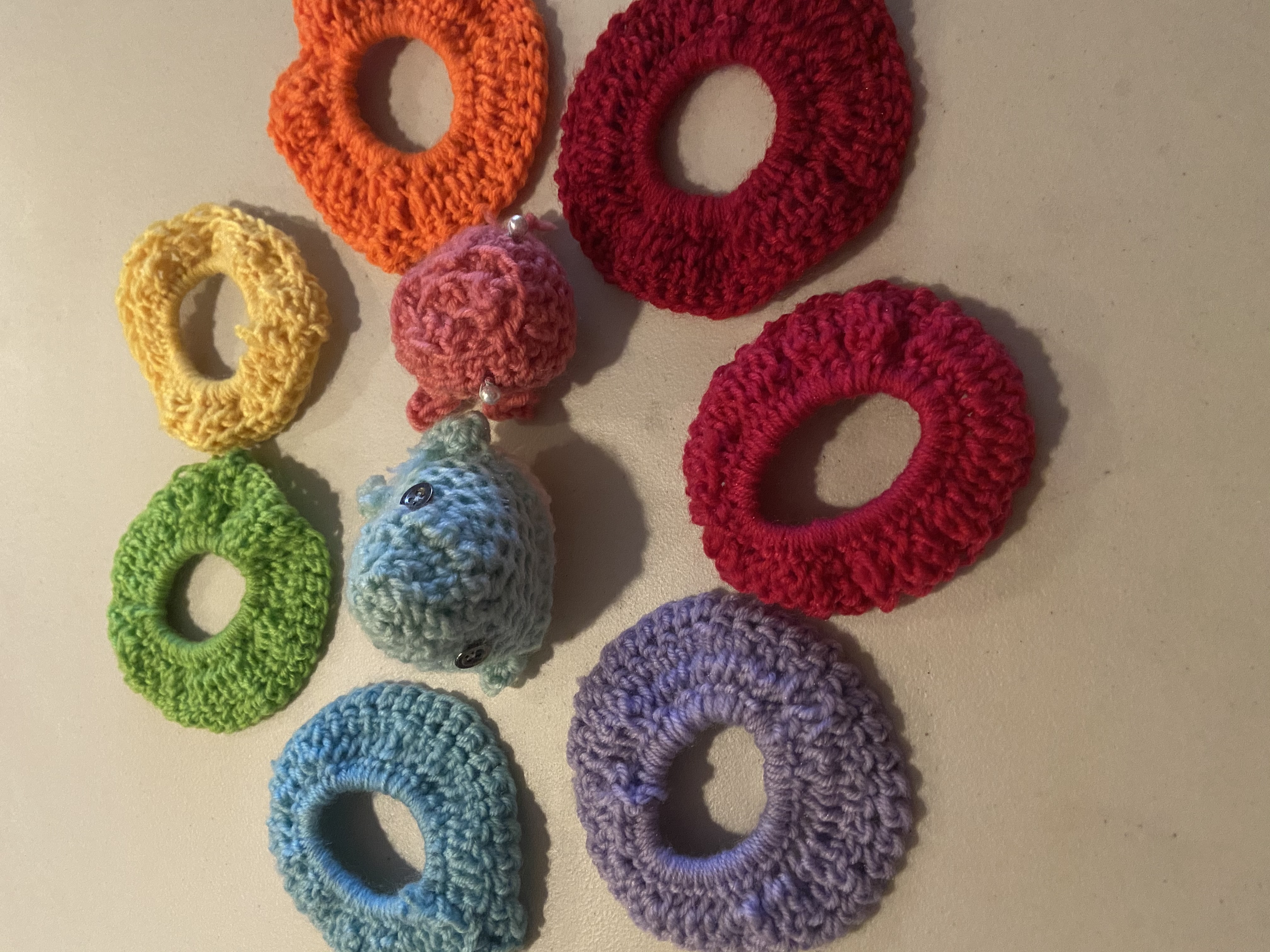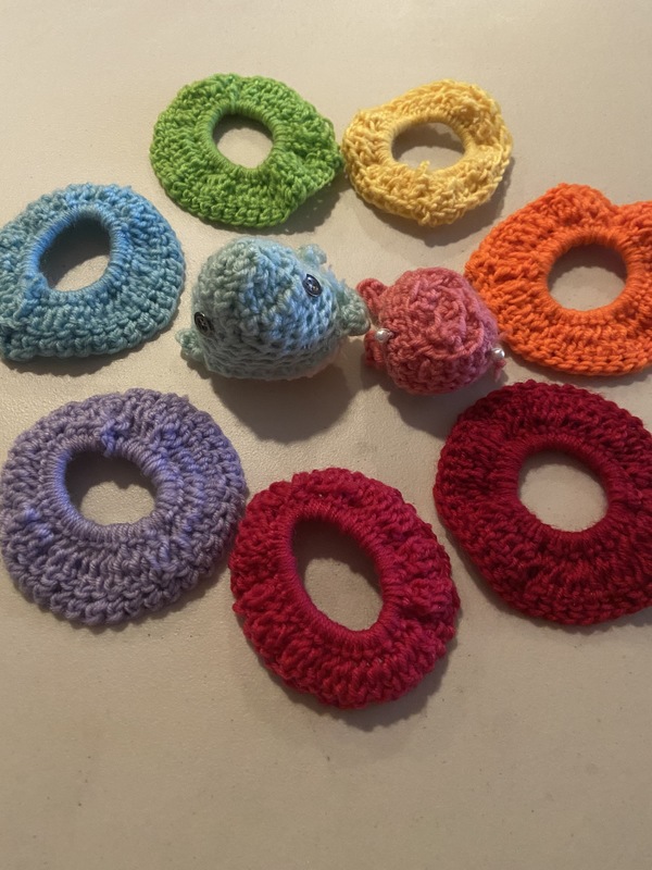 Crochet Scrunchies and little Amigurumi Whales that I crocheted