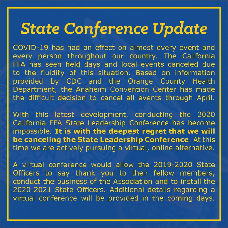 Statement issued by California FFA regarding the cancellation of the 2020 State Leadership Conference in Anaheim, California because of COVID-19. Large gatherings of any kind were quickly banned as the virus spread, preventing in-person conferences for extracurricular student organizations.