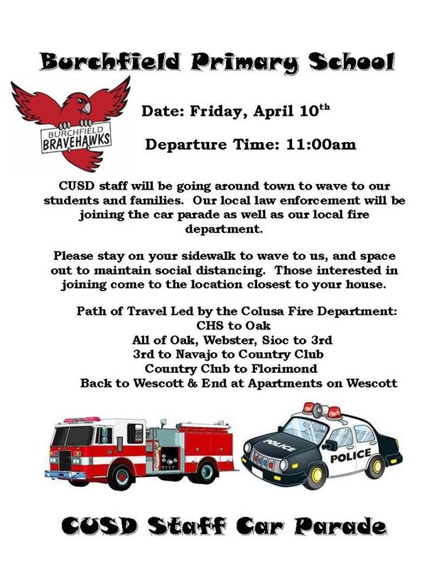 Flyer advertising a parade of school employees traveling through the city of Colusa, California. The parade was intended to allow separated students and teachers to see one another in person, albeit at a distance. Similar parades of teachers and school staff members occurred in neighborhoods around the United States during the COVID-19 campus closures.