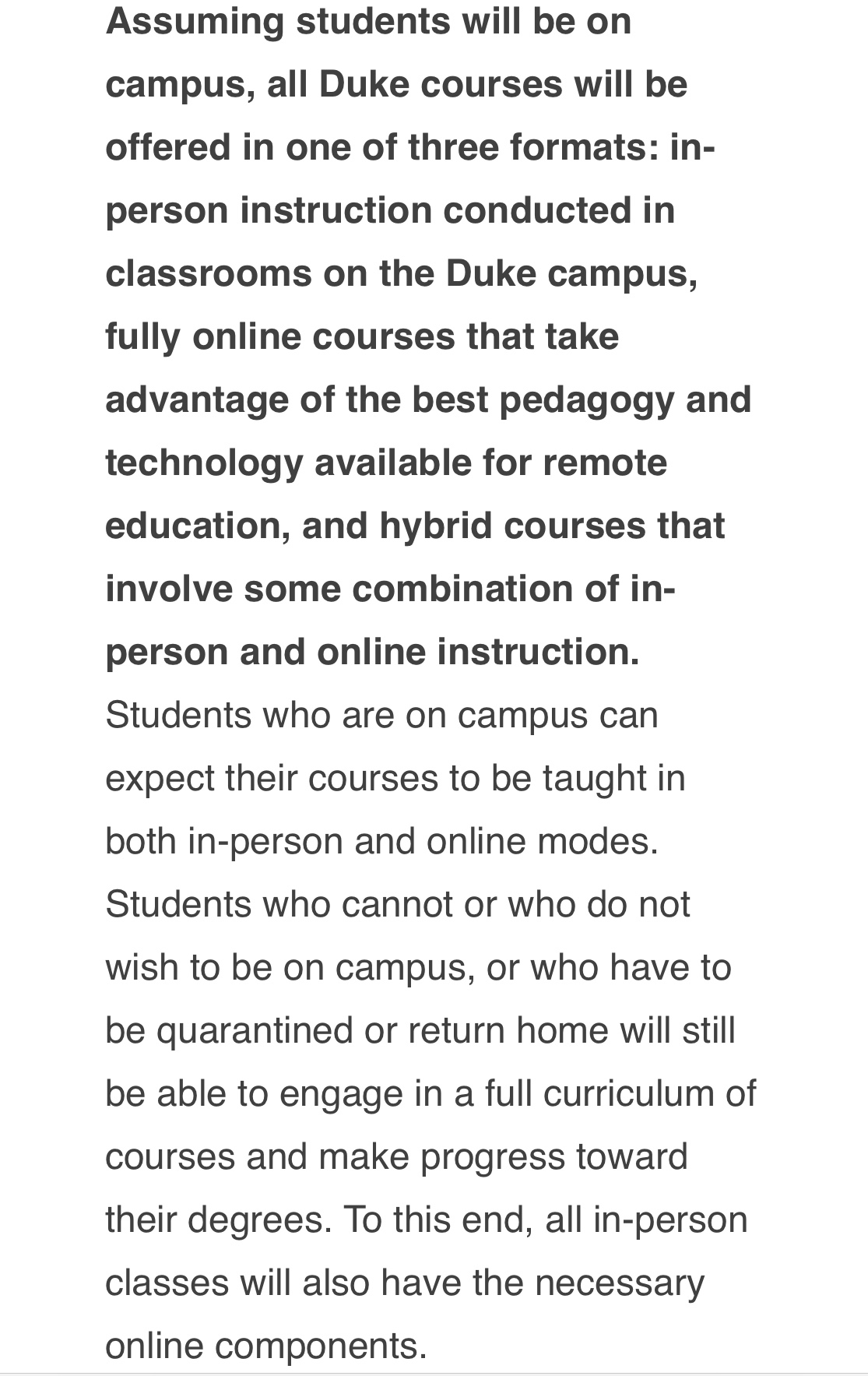 Given the fact that I am a newly admitted graduate student in Duke University, it is important for me to know the mode of education would be like in the coming academic semester or foreseeable future.