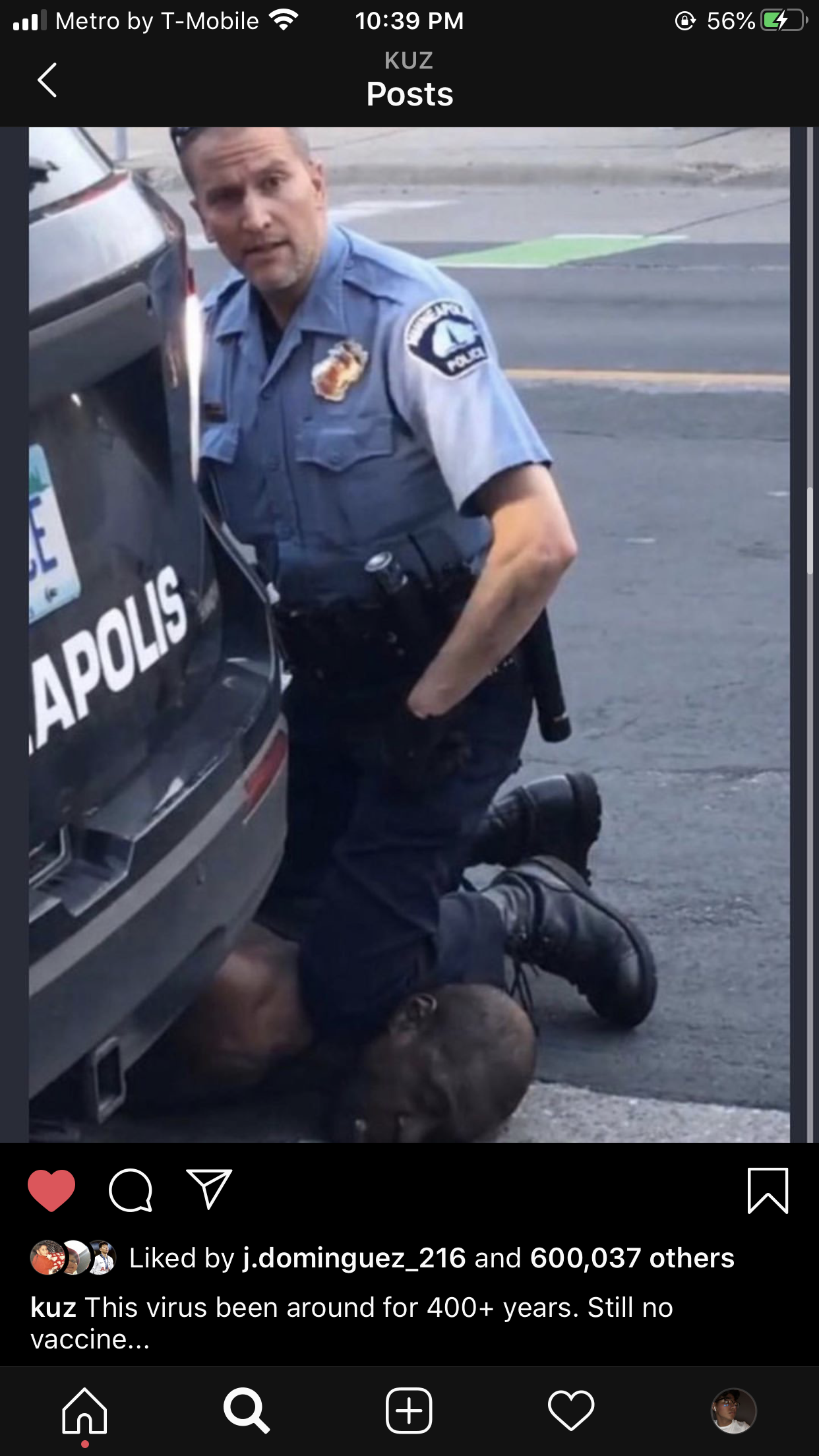 Kyle Kuzma posted a picture of recent events that said “this virus been around for 400+ years. Still no vaccine”. This talks about how as people have have chosen to ignore the disease that was already among us. We are taught that this nation is supposed to be the example that every other nation must follow. In history we are told that this nation is built on principles and that “ all men are created equal “ and have “ certain unalienable rights ”, but as history teaches us, that was a lie. Time and time again, we have seen riots, protests, violence, uprisings. We have seen people being discriminated against and killed for something they have no control over. How mush more violence do we have to seen in order for there to be change? This isn’t something new. We have seen it before. Slaves revolting against their “ masters ” for rights they should’ve had as human beings. We had a whole war over it. In fact, we don’t even have to go back that far, Martin Luther King Jr., The Black Panther Organization, Malcom X. These are people who have given their lives for the simple equal rights promised when this nation was built. They gave their lives and it still wasn’t enough. 1992, Rodney King was beaten by police officers and it was caught on film and those officers were found not guilty, Latasha Harlins was shot and killed by a store owner and the jury didn’t rejected a harder sentence. Riots destroyed LA, people and businesses died. It took that in order for action to be taken. Protesters riot, loot, and assemble to be heard. There is no rules to protest, there is no right way to protest. That is what a protest is. I am ashamed that it is a constant issue in which the US does not learn from their mistakes. Let’s not repeat history again. That is the point of learning about history, for us to see the mistakes made and grow to be a better society. There doesn’t need to be more death, more violence. It’s time to treat people right. It’s time for change.