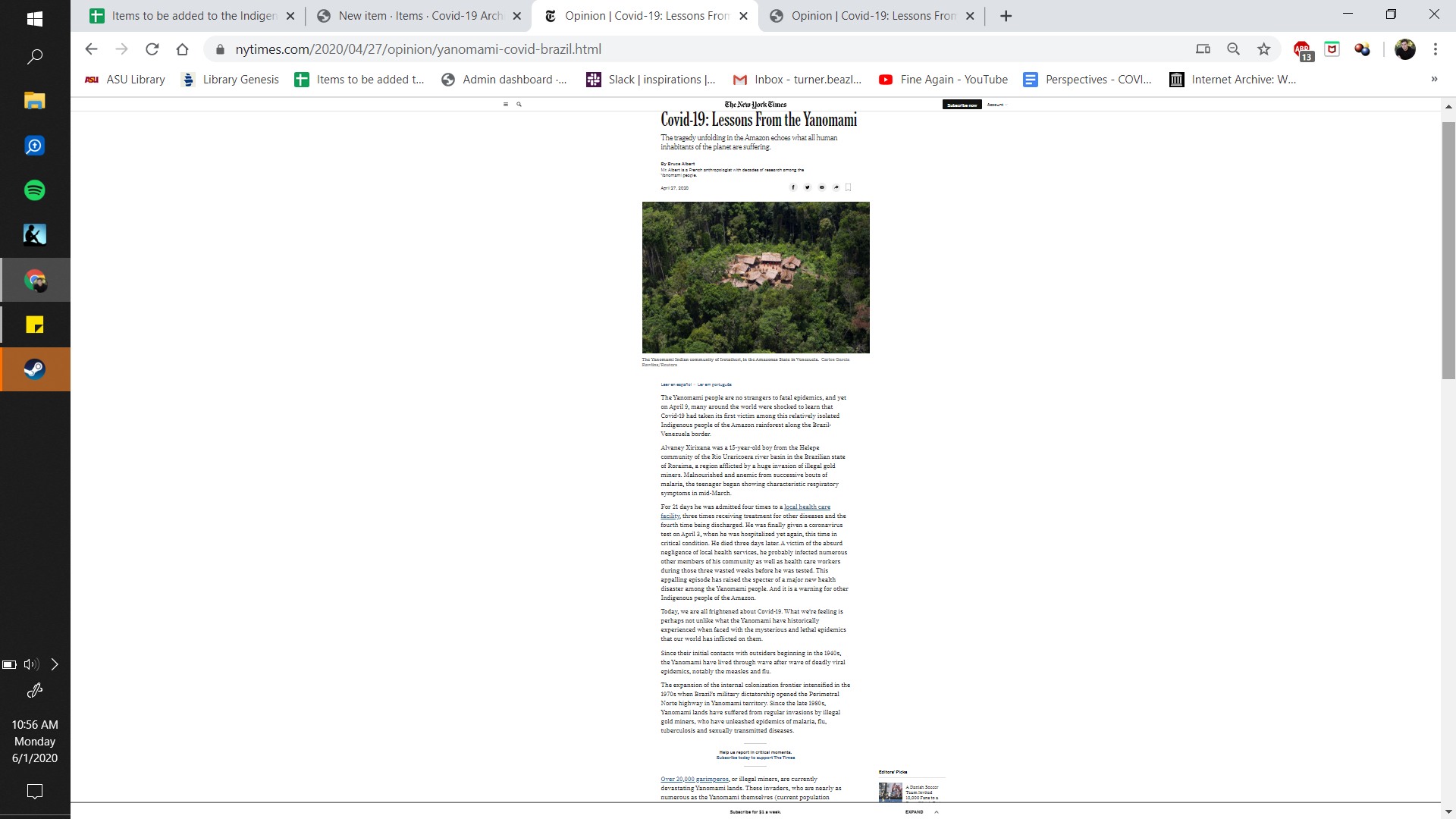 "Since their initial contacts with outsiders beginning in the 1940s, the Yanomami have lived through wave after wave of deadly viral epidemics, notably the measles and flu."