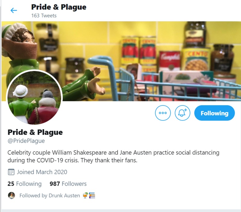 A comedy account, featuring figurines of Jane Austen and William Shakespeare wearing cut down bandaids and fabric as masks and pretending to navigate a pandemic world as the historical figures would.