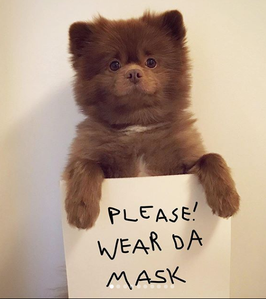 A image of the instagram famous dog Bert the Pomeranian, looking forlorn and holding a sign which reads, in mock childish writing to make it appear that he is the one that wrote it, "Please! Wear Da Mask." This image has been frequently shared on other people's Instagram stories as a plea for wider-spread use of masks. It taps into the influence of social media stars and popular accounts, such as those dedicated to dogs to promote healthy habits during the pandemic. By having a dog say it the message is softened for those who find it confrontational while still getting its point across.