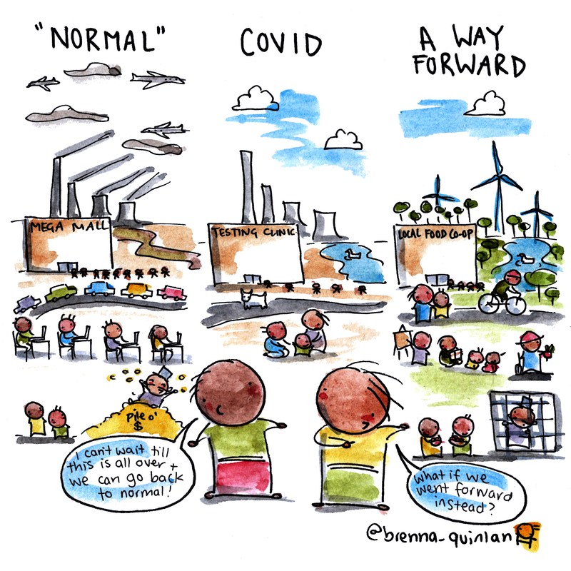 A single panel comic/ piece of artwork shared across multiple social media platforms pointing out the unsustainable nature of "returning to normal" after the pandemic and the potential opportunity this gives us as a society to make changes towards sustainability. The artist is an environmental advocate and farmer.