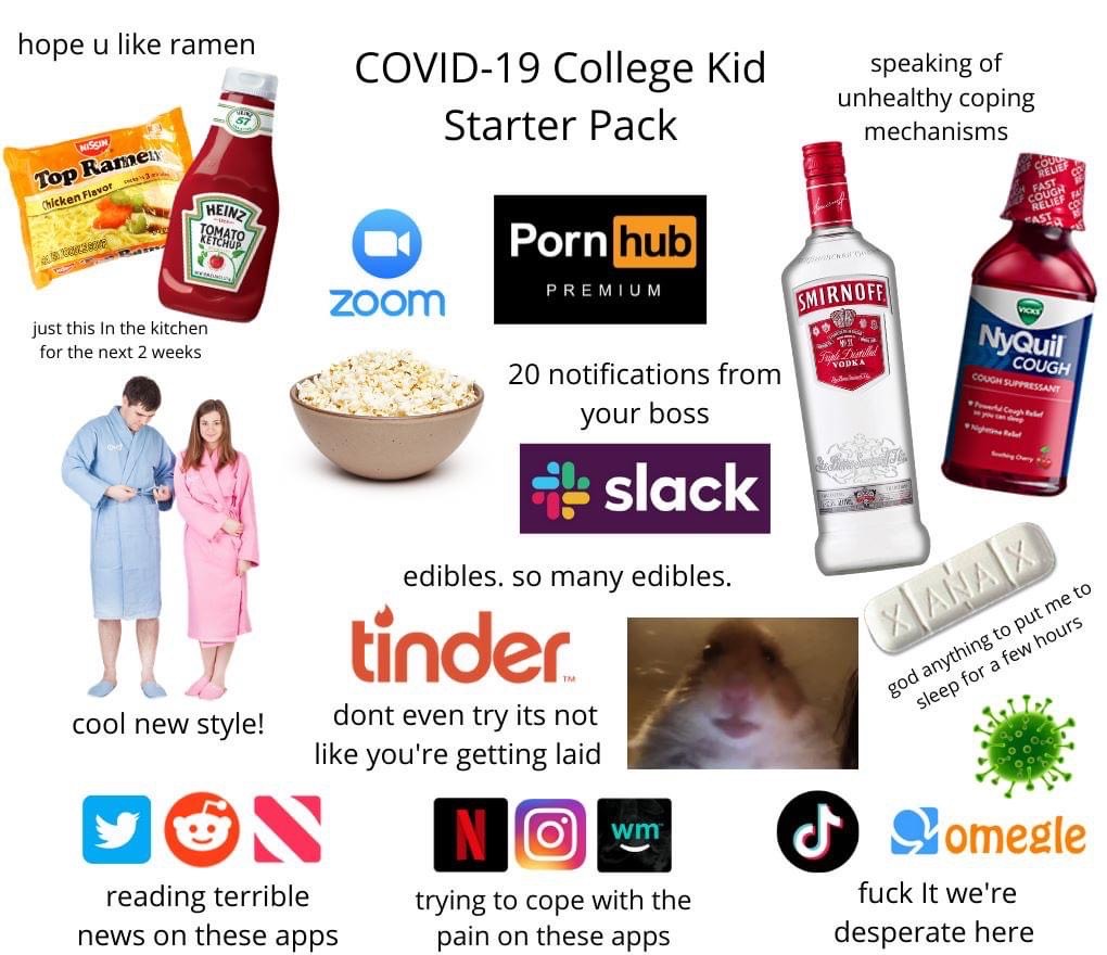 Very relatable meme. As a fellow college student, I have just been sitting around my house in pajamas. I have been eating a ton of popcorn and ramen. I drink alcohol with my roommate to try and avoid boredom. I find the news so overwhelming, scary and depressing so I've hidden the news app and Twitter on my phone so I'm not tempted to look at those and make myself feel worse. I stream shows and use social media to distract myself.