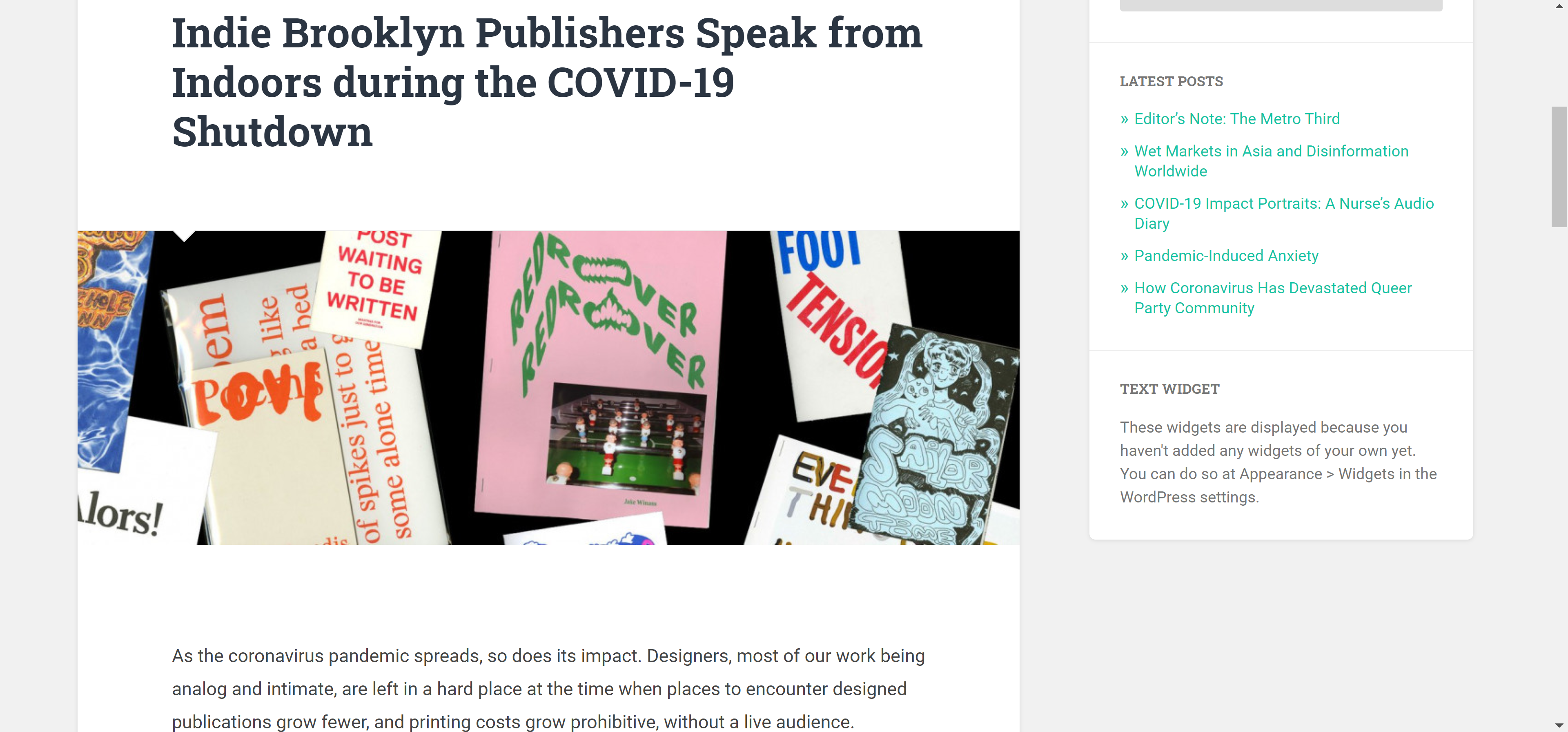 This article includes interviews with Robert Blair and Kurt Woerpel, two of the four founders of TXTbooks in Brooklyn on how publishers are changing with the COVID-19 pandemic and was written by a senior journalism student following a beat developed and thought about in terms of the "local" in a journalism course at Pratt Institute that was upended by the pandemic.