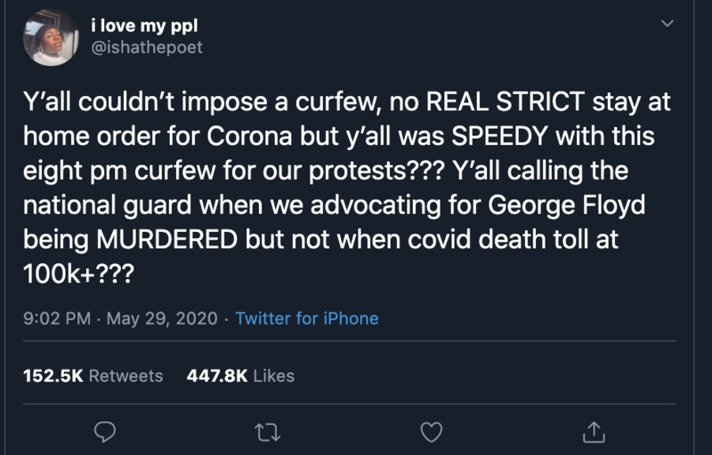 This tweet calls out government hypocrisy between lack of action with rules to limit human interaction and prevent them from contracting COVID but the quick response to shut down protests and put curfews in place for those protesting against police brutality and the murder of George Floyd.