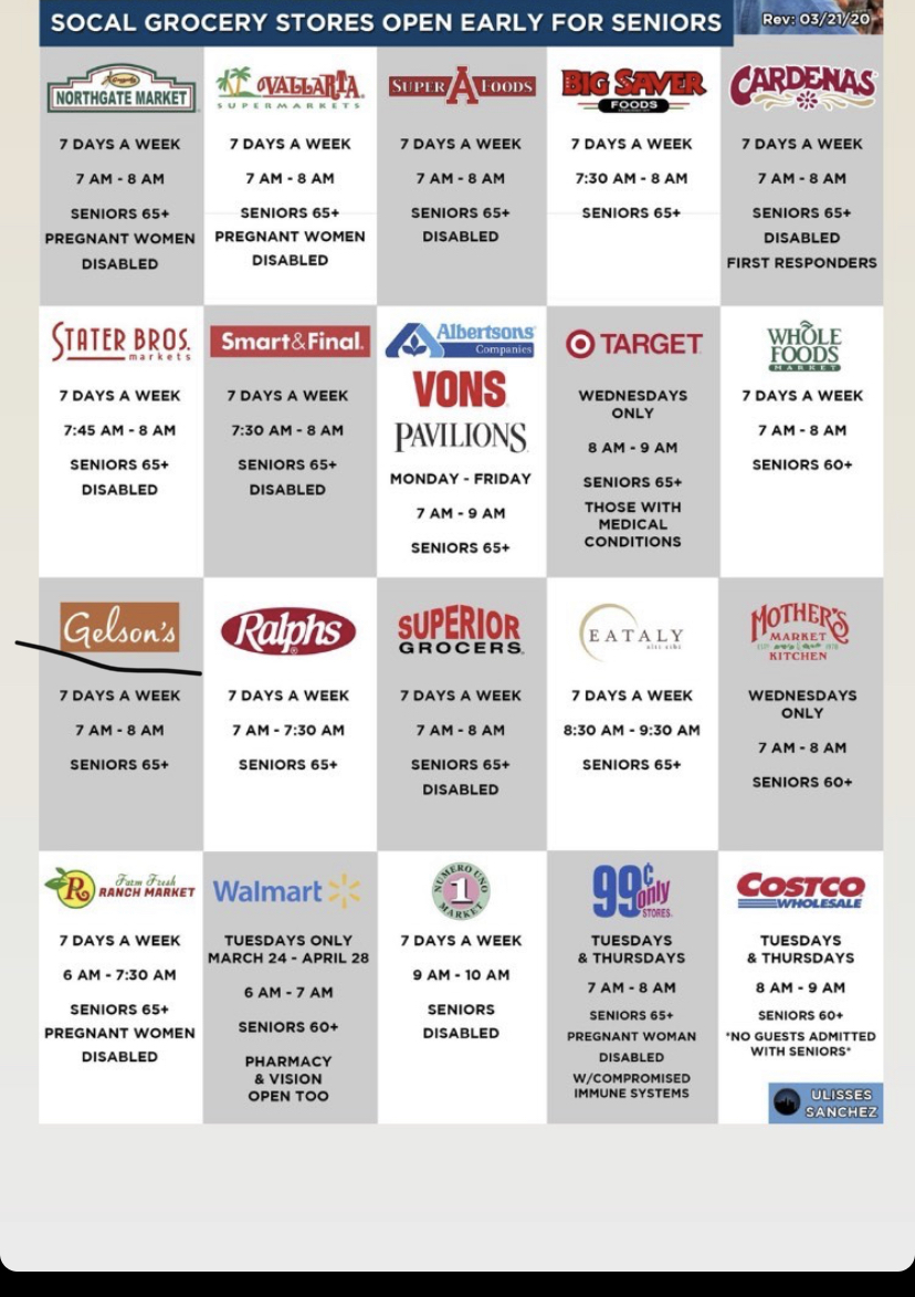Soon, most stores offered "senior hours" which allowed the older citizens to shop early without waiting in the lines and with less people in the store, thus reducing the risk of contagion. This is a flyer the town of Glendale, California put out to inform those who needed to shop early.