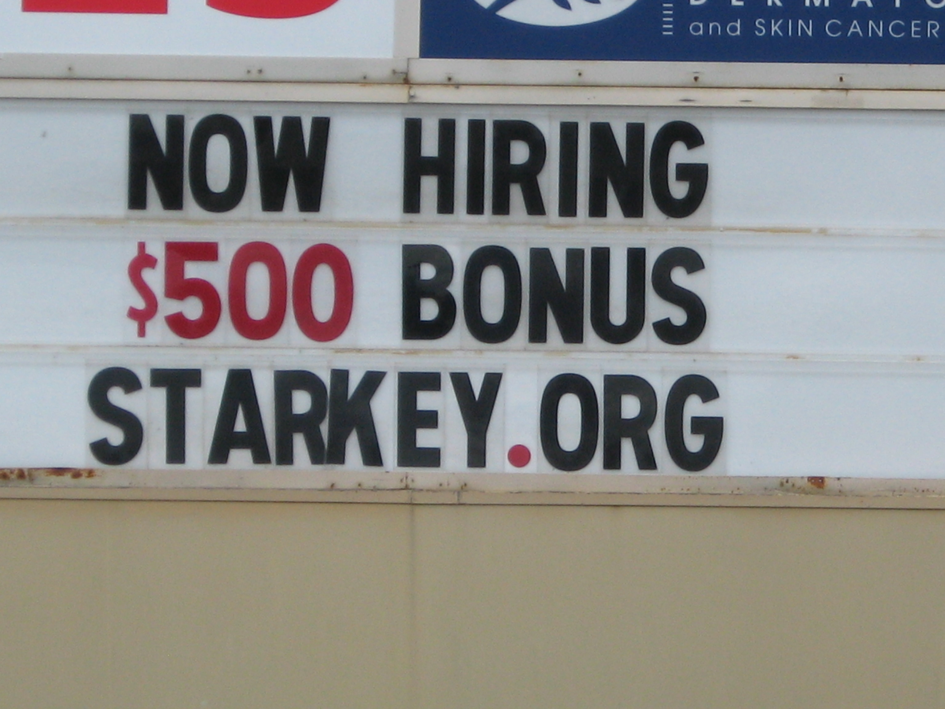 While many small businesses shed jobs in the face of lockdowns, special needs communities saw an urgent need for more help to keep their residents safe from contracting the virus. One recruiting inducement was the promise of a hiring bonus, such as the one depicted in this photograph.
