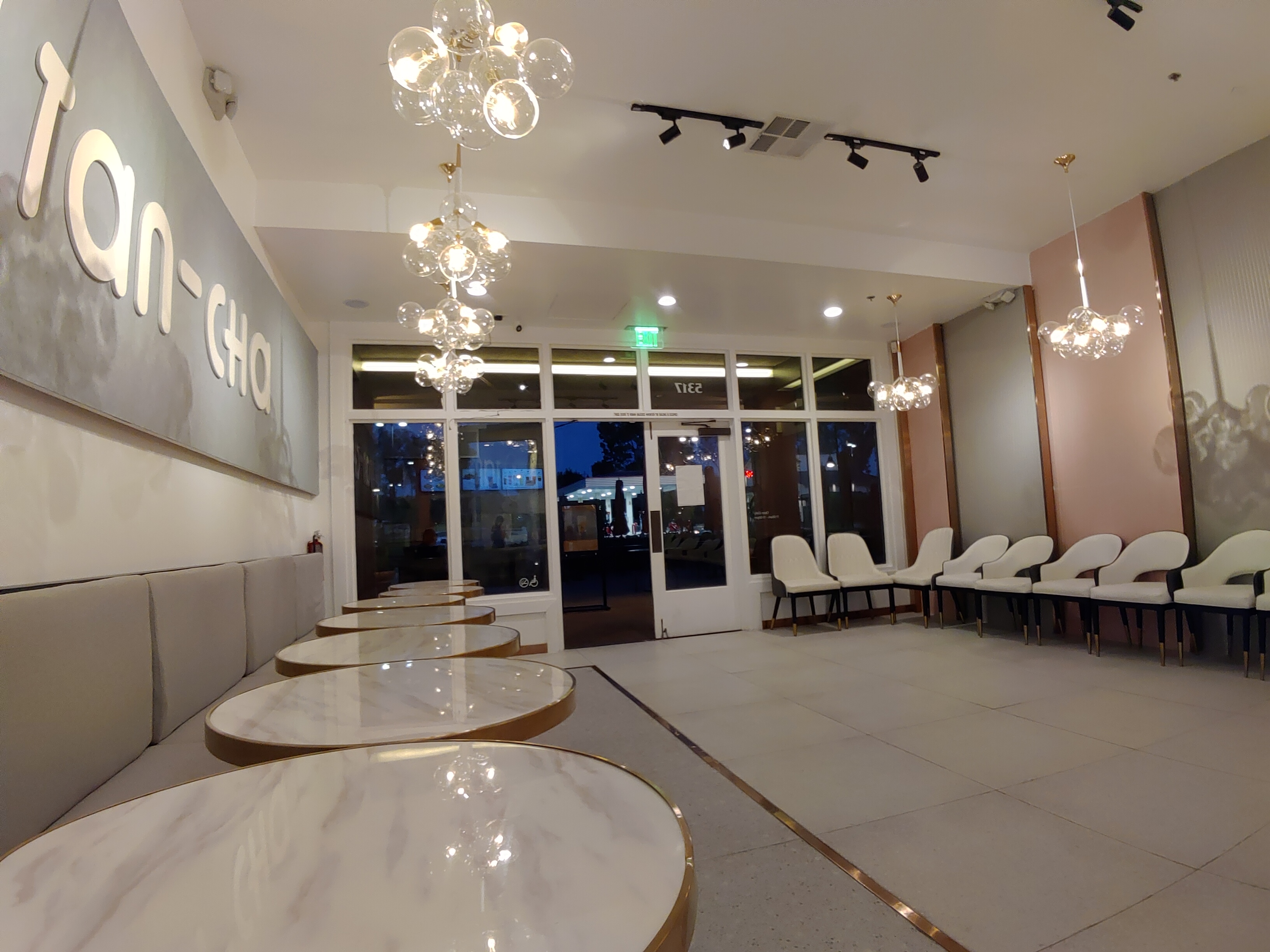 Tan Cha is a popular boba tea shop chain. This is the newly opened Irvine location. They have prepared tables and seats for indoor seating but are unable to utilize them due to the ban on dining in. To facilitate social distancing, all the tables and chairs have been shoved to the walls, leaving an unusually large open floor in the middle.