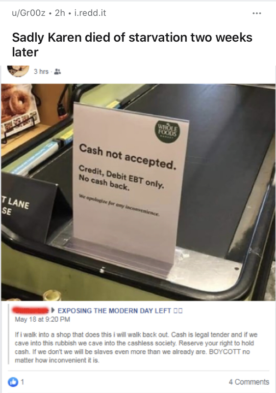 Businesses, such as grocery stores, have taken precautions such as having plexiglass shields and only accepting electronic payments to avoid the spread of the virus. Some, like the woman in this post, feel that this infringes upon their rights and calls for a boycott of such businesses. This woman additionally refers to her post as “exposing the modern new life,” indicating how safety standards and a person’s choice whether to abide has become politicized. The person who shared this post on reddit.com/r/insanepeoplefacebook mockingly calls the poster “Karen,” and states she “died of starvation two weeks later.”