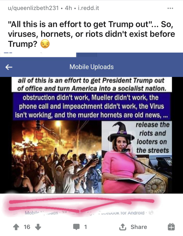 Some skeptics have lumped all the events of the past couple of years, including Coronavirus, into a giant conspiracy to take down Donald Trump and turn America socialist, This post claims Mueller, impeachment, Coronavirus, and murder hornets haven’t worked, and are suggesting the Black Lives Matter protest is the next in a string of conspiracies. The person who shared this to reddit.com/r/insanepeoplefacebook mocks it by asking if these things didn’t exist prior to a Trump.
