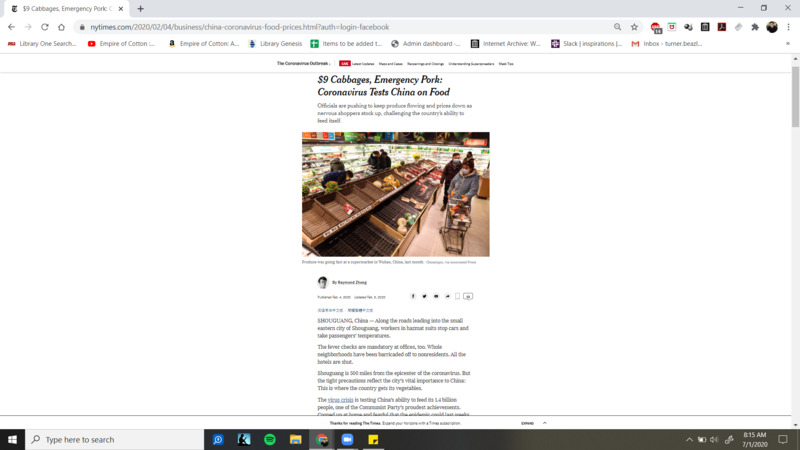 The virus crisis is testing China’s ability to feed its 1.4 billion people, one of the Communist Party’s proudest achievements. Cooped up at home and fearful that the epidemic could last weeks or even months, families across China are hoarding provisions, making it harder for shops and supermarkets to keep fresh food in stock. Many places have closed off roads to passing traffic, slowing truck shipments and raising freight costs.