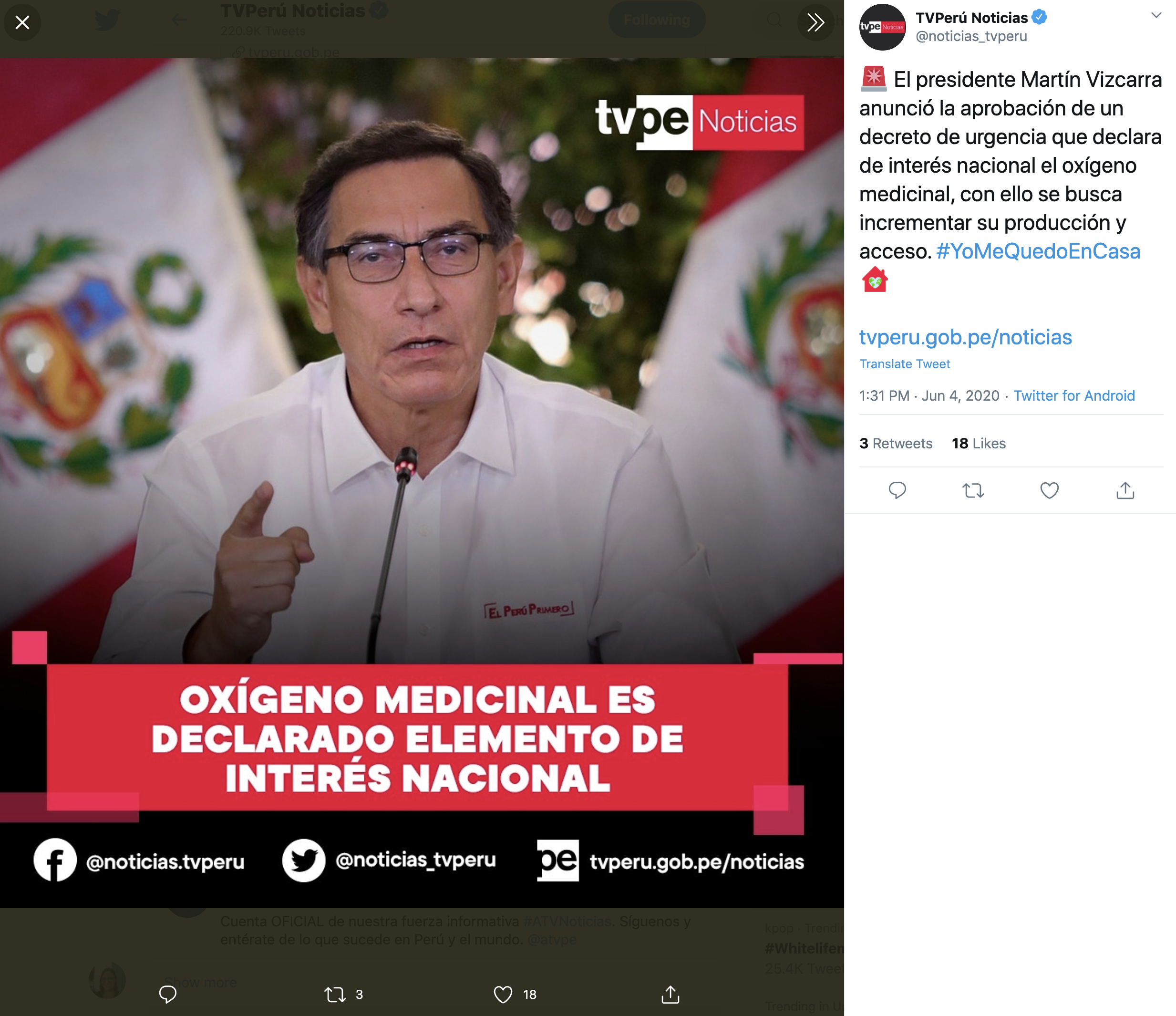 El presidente Martín Vizcarra anunció la aprobación de un decreto de urgencia que declara de interés nacional el oxígeno medicinal, con ello se busca incrementar su producción y acceso. #YoMeQuedoEnCasa