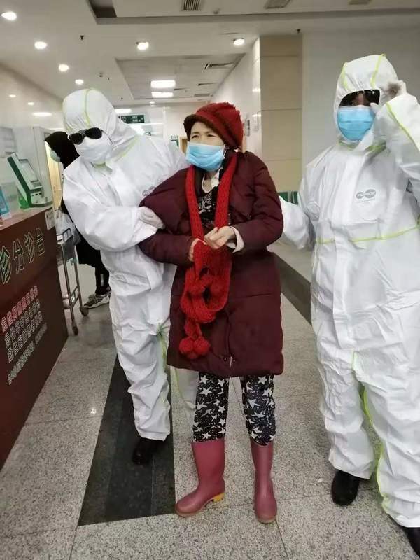an elder lady in a hospital who may infect the coronavirus was holding by two administrators.