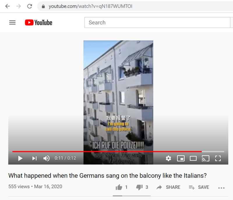 Original description: "Videos of Italian citizens singing and dancing from balconies during lockdown have been shared widely on global social media and have inspired many in the world. One German tried to imitate and sang from his own balcony to boost morale amid the pandemic, and it turned out … differently."