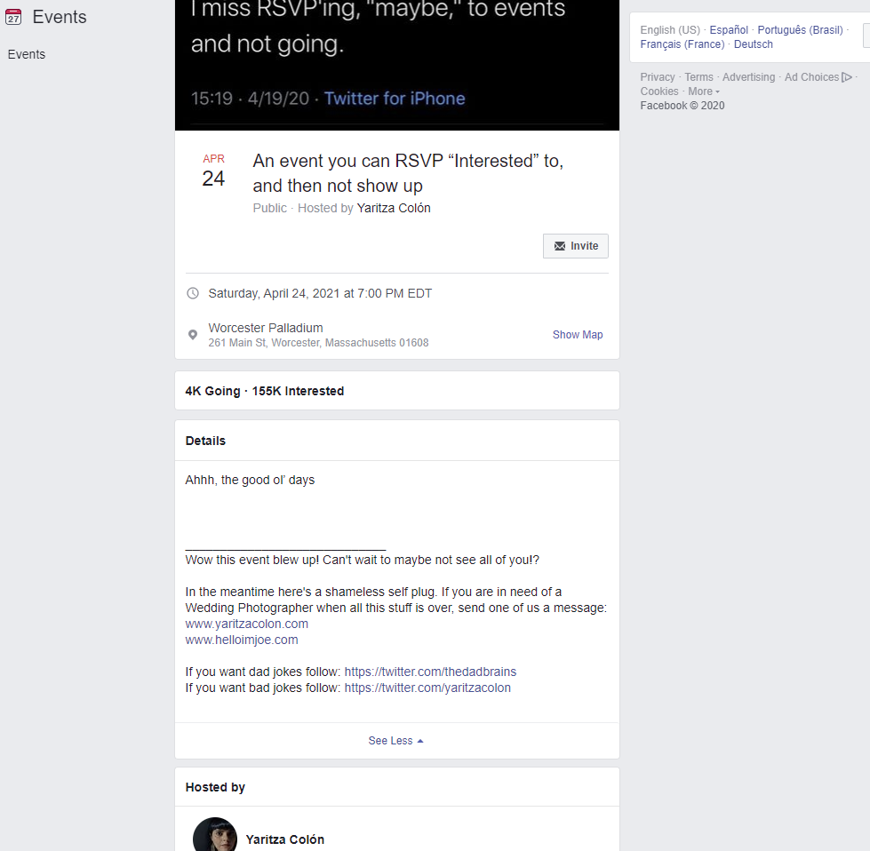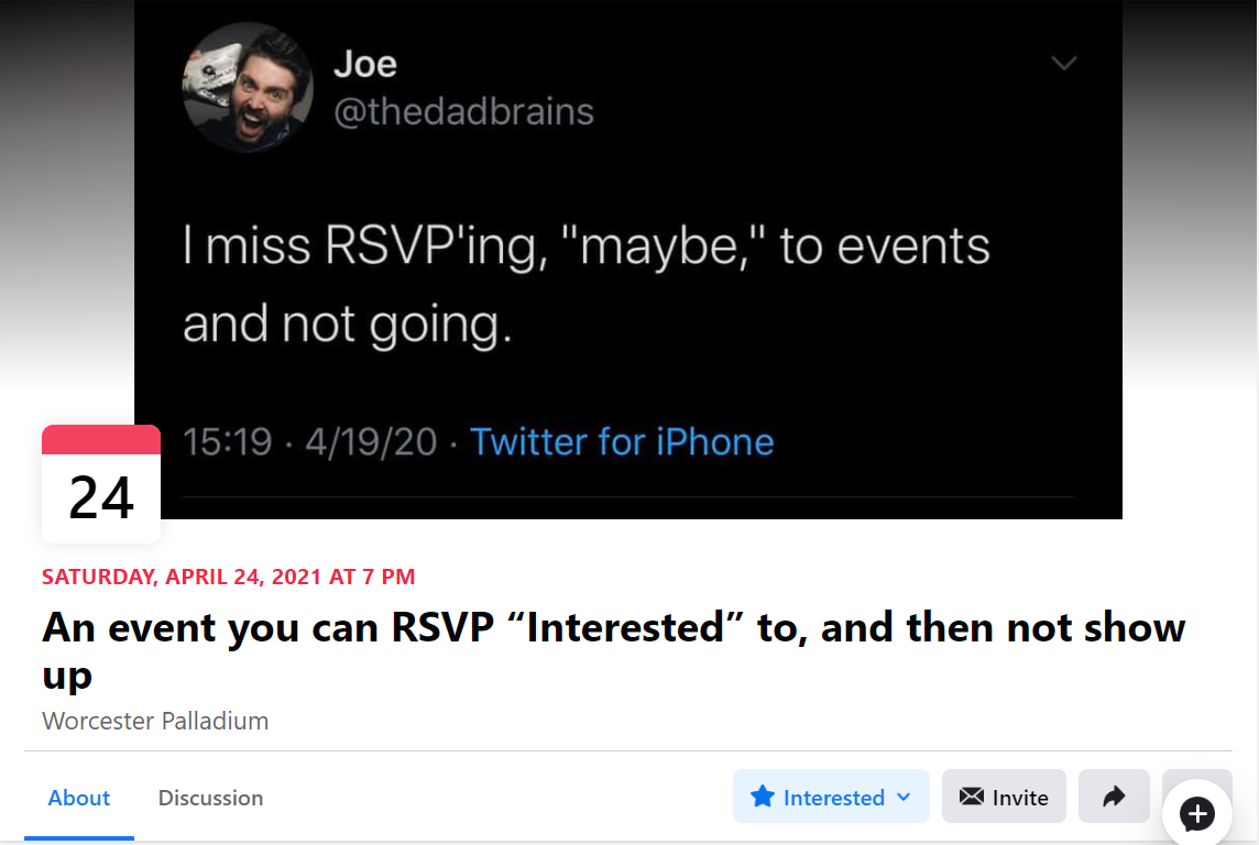 This post follows the format of joke Facebook events not intended to actually occur and referencing the tendency of people to RSVP to legitimate Facebook events and then decide not to attend before the pandemic. It was created in response to the tweet which features as the background image for the event page. At the time this was shared with the archive, just under 160 thousand people from around the world had responded they were "interested" in this "event."