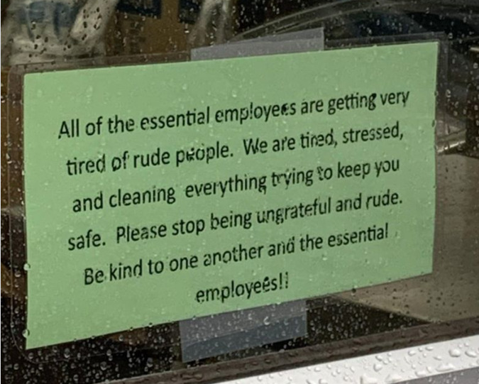 A sign taped up in an unknown store window expressing the staff's frustration and asking for kindness following incidents in which customers were rude to already overworked staff.