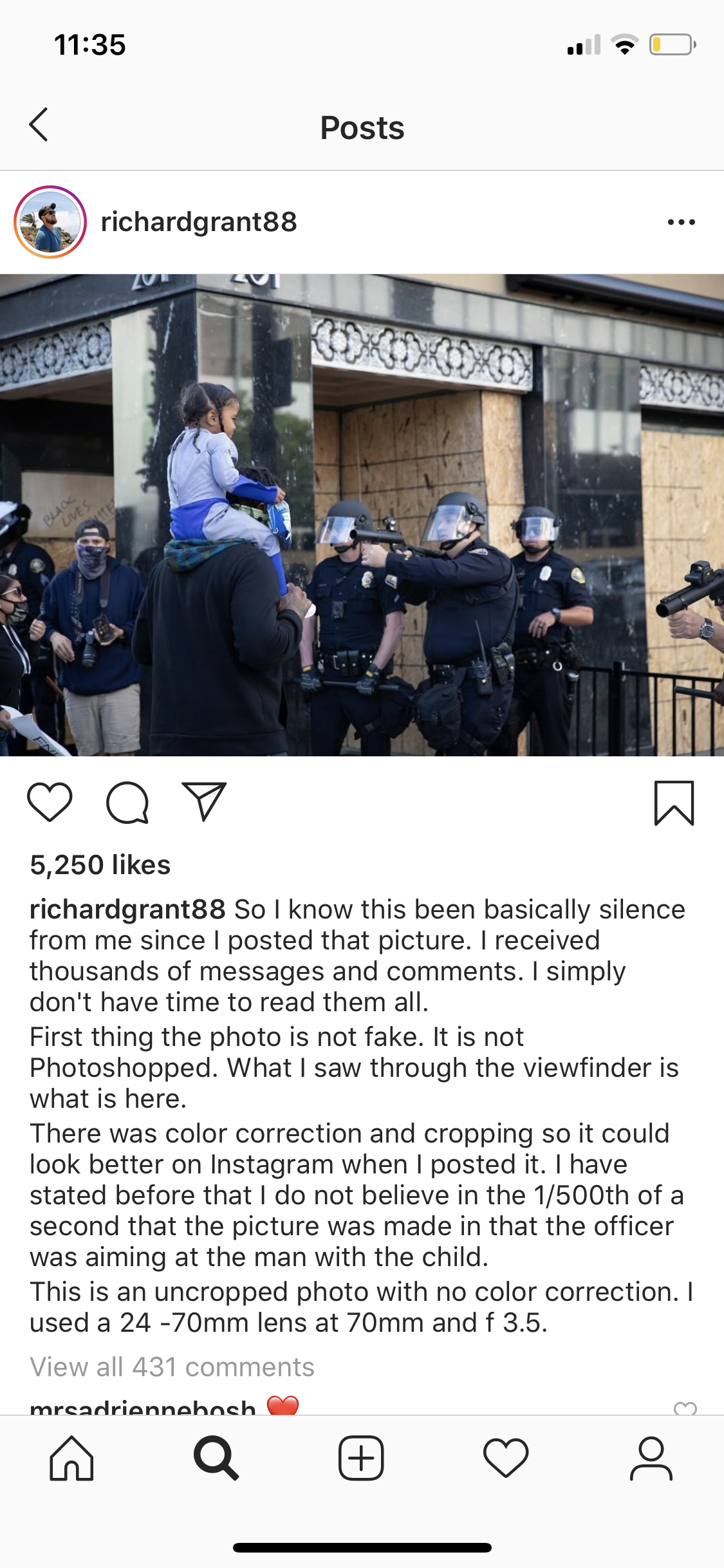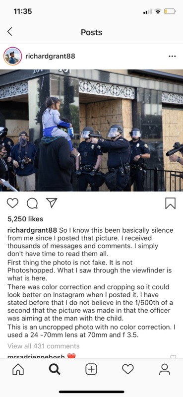 Photographer, Richard Grant, captured a photo of a child sitting atop their father's shoulders during the Long Beach, California protests that followed George Floyd's death. It appears as if the cops in the photograph are pointing a rubber bullet gun directly at the father and child. The photographer recently posted the unedited photograph to Instagram and a caption stating that the photograph is not fake and that he does not believer the officer was intentionally or directly pointing the gun at the father and child. This statement by Richard Grant combats one of the reasons that perhaps the photograph went viral in the first place. Namely, that the officer was deliberately pointing the gun directly at the child. "First thing the photo is not fake. It is not Photoshopped. What I saw through the viewfinder is what is here. There was color correction and cropping so it could look better on Instagram when I posted it. I have stated before that I do not believe in the 1/500th of a second that the picture was made in that the officer was aiming at the man with the child. This is an uncropped photo with no color correction. I used a 24 -70mm lens at 70mm and f 3.5." Deliberate or not, the photograph reminds us to stop and think about the impact the events of 2020 are having on our children today and in the future.