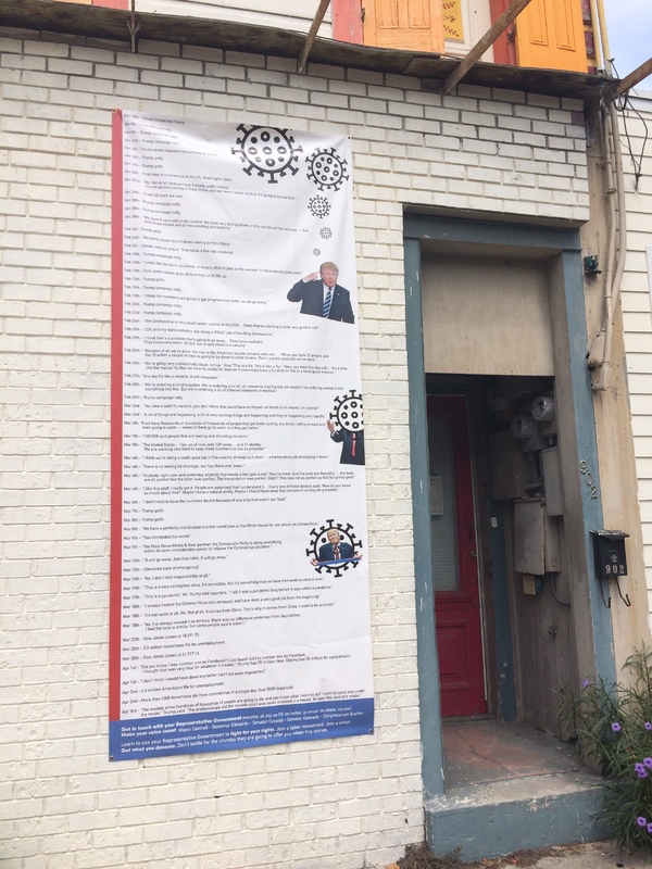 A huge timeline of Trump's statements and actions during the COVID-19 pandemic hung on the exterior wall of a home in New Orleans, LA.