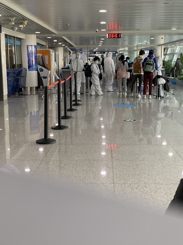 This is in the Chinese airport. People flight from US and get into China. Some of them wear protection suit. And all people wear face mask. Behind the people in the image, there have many doctors ask your question about where do you live in the US to check your risk of carrying COVID-19.
