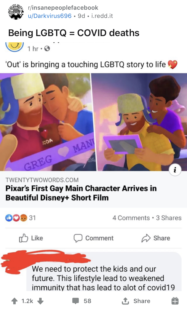 In a post unrelated to COVID-19 that celebrates a new Pixar short featuring gay characters, a commenter blames homosexuality for “weakened immunity” that they claim has led to COVID-19. This was shared to http://reddit.com/r/insanepeoplefacebook.