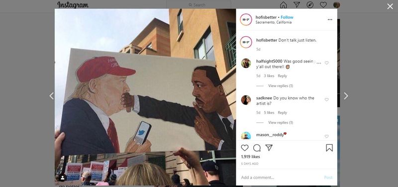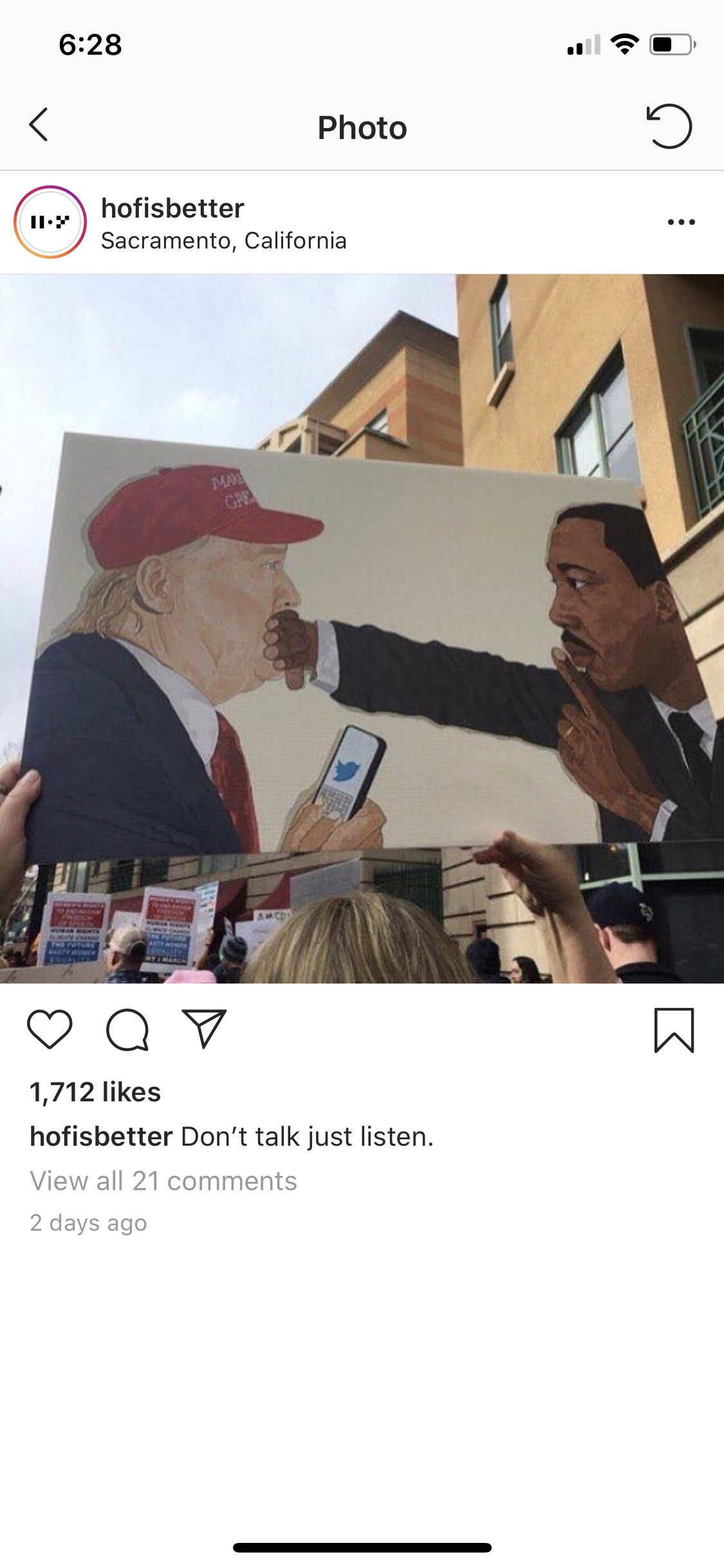 I was moved by a photograph that I saw of a protestor holding this painting in what appears to be a peaceful march in Sacramento, California. The message is clear - it is time for America's leaders, and for all of America, to listen.