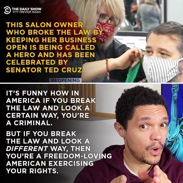 Public figure Trevor Noah compares the difference between breaking the law for people who look different by comparing a woman who continued to operate her salon during the shutdown. People praised her for her actions by calling her a "Freedom-loving American". But Trevor Noah is saying that if she had looked different she would have been called a criminal. Currently there is much social focus on the injustices within the legal, criminal and justice systems within America. There is an ongoing debate on what it means to have white-privilege, and what it means to be black in America.