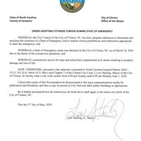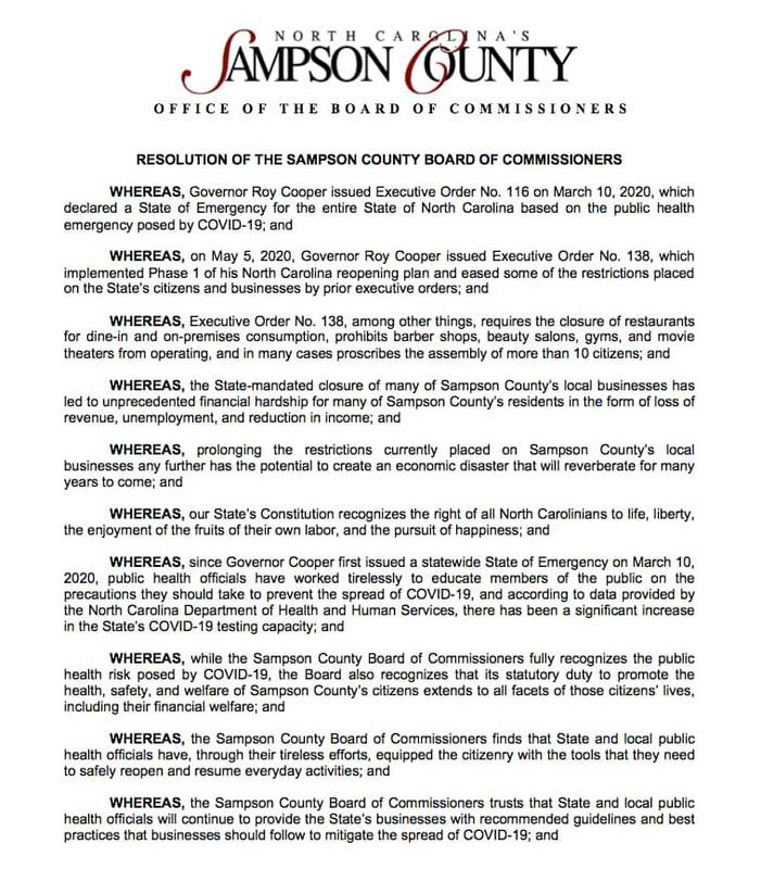 This is a copy of the executive order given by Governor Roy Cooper which declared a state of emergency for the state of North Carolina due to Covid-19 as well as Sampson County's compliance with that declaration.