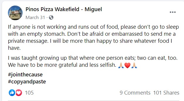 This is a post made by Pinos Pizza, a pizzaeria in Wakefield, Virginia. Following the shortage in groceries across the country due to Covid-19, Pino's offered to feed anyone locally who was unable to secure groceries. Prior to the pandemic, there wasn't a single restaurant in Wakefield that even offered delivery. Regularly, these local restaurants aren't exactly full of business given how small the Wakefield community is. In some ways, the pandemic has forced Wakefield to somewhat modernize.