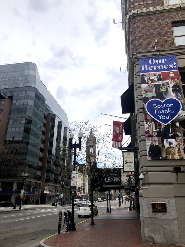 This is a photograph of a sign in the Greater Boston area thanking essential workers for their service. This sign illustrates one of the ways in which Boston has responded to Covid-19