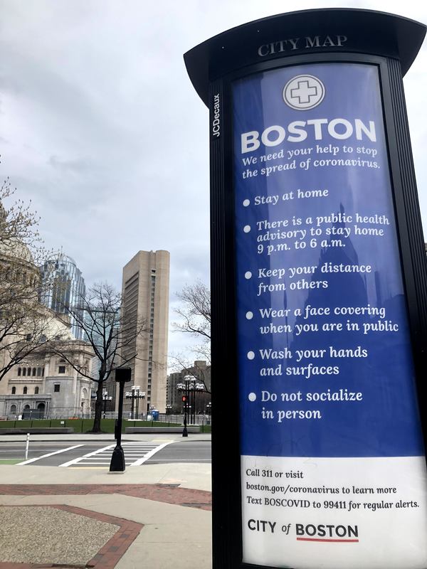 This is a photograph of a local advertisement/information regarding public health in Boston during Covid-19. This sign offers advice and information for dealing with Covid-19 and advises people to stay home. This information is especially important to save because Boston had so many cases of Covid-19.
